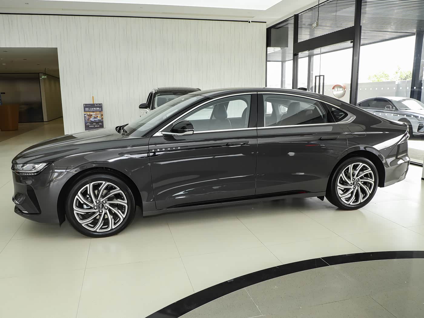 再来看车身侧面部分,林肯Z的车身尺寸为4982mm×1865mm×1485mm,轴距达到了2930mm,这样的尺寸在中型车市场中优势明显。将近3米的轴距为车内空间奠定了良好的基础,而不到5米的车长则使其在城市道路中行驶更加灵活,停车也更为便捷。车身侧面线条流畅,采用了溜背式设计,从车顶一直延伸至车尾,营造出一种蓄势待发的姿态。大尺寸厚壁轮胎与车身比例协调,进一步增强了车辆的运动感。不过,溜背造型也带来了一些小问题,后窗可视范围有所缩小,倒车时需要高度依赖影像系统。
