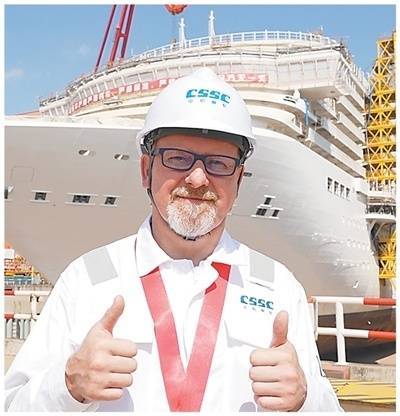 罗瓦蒂在建造中的“爱达·花城号”邮轮前。 回盛瑶摄