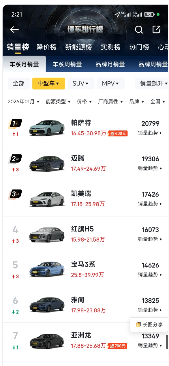 更尴尬的是,部分车企为了吸引流量,将实则为 C 级车的车型归为 B 级车,导致市场定位混乱,20 万预算的用户看这些车型时,要么价格超标,要么配置缩水,真正的纯电 / 大电池混动 B 级车却始终处于市场空白。而新能源 SUV 赛道的持续火热,更是分流了 B 级车的潜在用户,20 万级的新能源 B 级 SUV 凭借空间实用性、通过性优势,更受家庭用户青睐,进一步挤压了新能源 B 级轿车的市场空间。